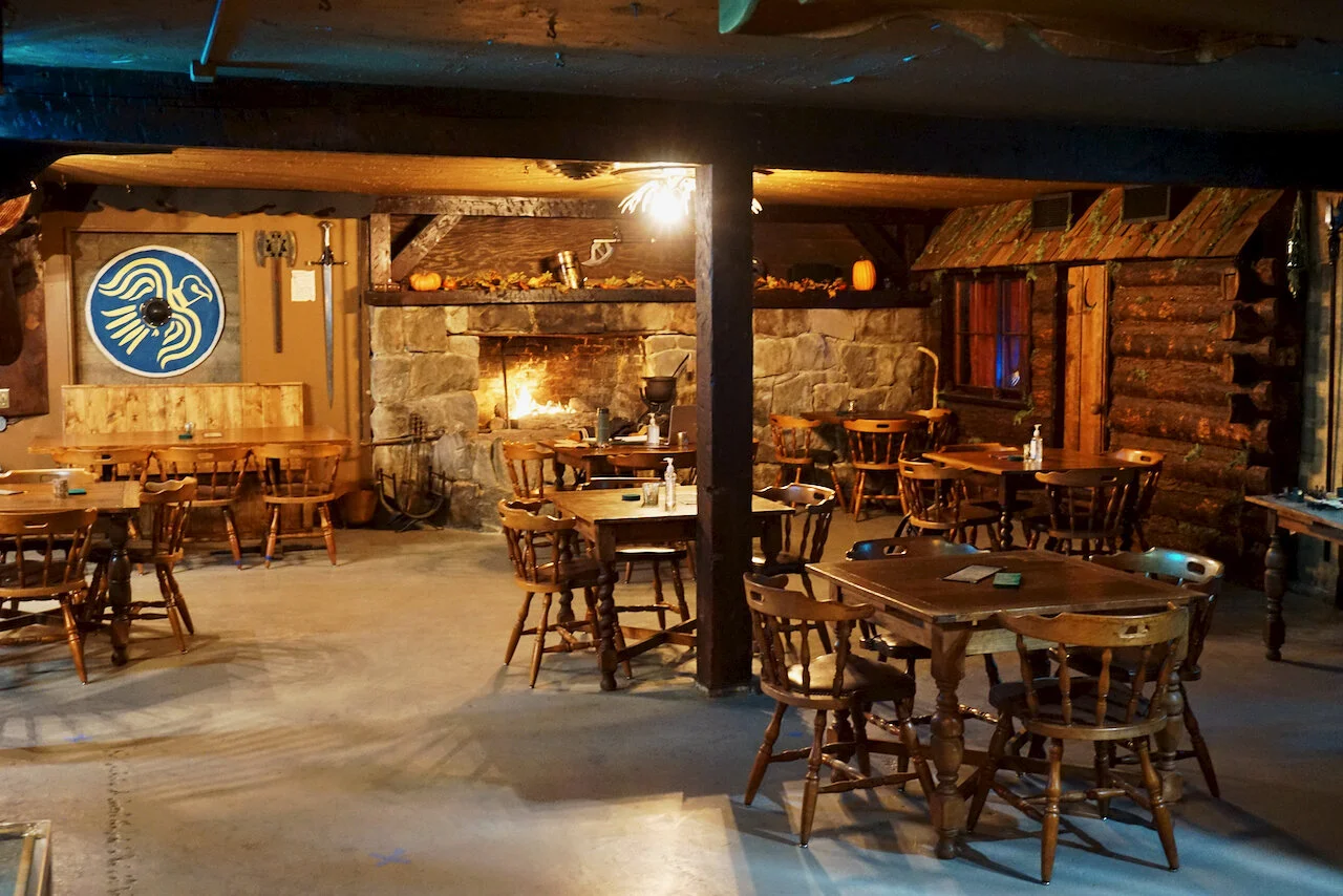 The pub side area of Wyrd Mead hall is all old timber, hand carved wood and cobbled stone with a newly finished bar top and extensive selection of bottles. The booths look like something out of Excalibur and the floating tables look like they were salvaged from the Horse Brass. A massive roaring stone fireplace and the strange face of a creepy cabin in the woods along the northeast corner of the dungeon-like space adds to the lore that the building is haunted.