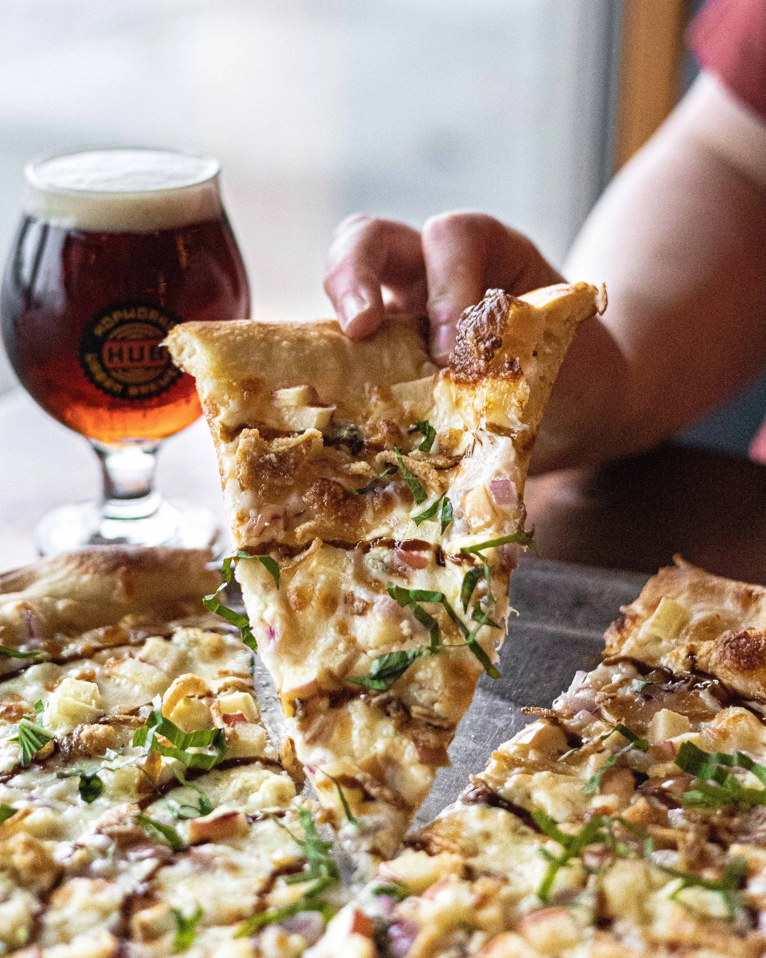 New at the pubs, Hopworks will also be releasing the Apple Of My Eye pizza alongside Bourbon Barrel Aged Abominable Winter Ale. Apple Of My Eye has a garlic oil base topped with mozzarella, blue cheese, local Honeycrisp apples sourced from Rainier Fruit Co., diced red onions, crispy onions, and a balsamic glaze swirl. Rich but balanced, the pizza highlights the crispness of Honeycrisp apples through the funkiness of blue cheese and the intensity of the balsamic glaze. It pairs perfectly with the citrus spice and vanilla notes of Bourbon Barrel Abominable.