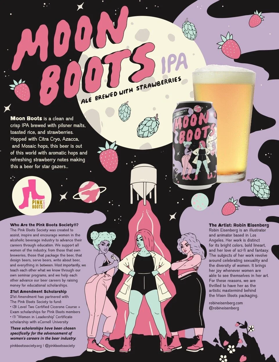 Robin Eisenberg comments, "I've always loved celebrating women in my work, and working with 21st Amendment on this was so much fun! I think it's amazing that Moon Boots IPA is not only recognizing women in brewing, but it's also helping to create more opportunities for future women in the industry. So happy I could be a part of the project!"