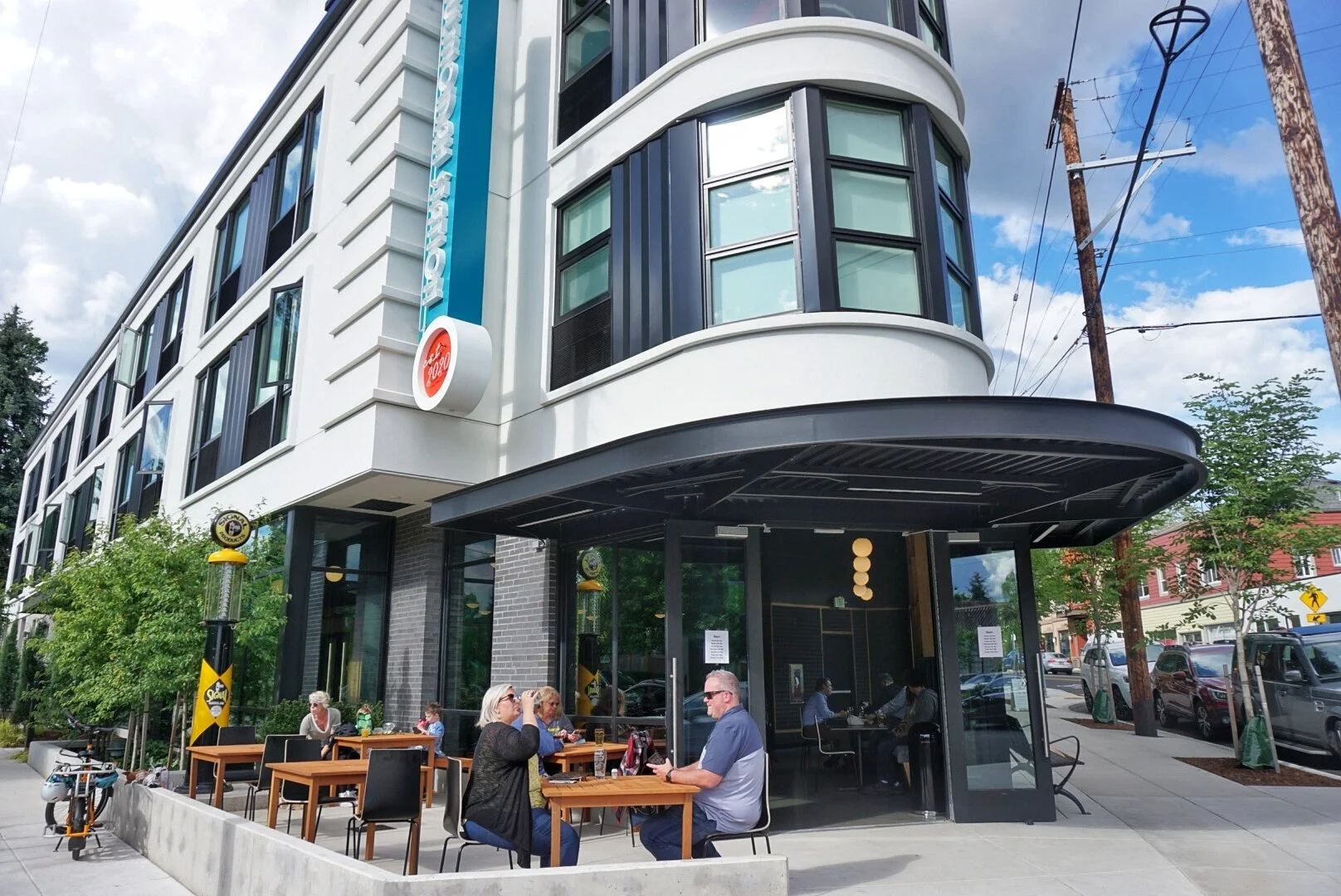 Oakroom is the front triangular corner business of a new building standing at SW Capitol Highway and 32nd. Erected on the location of a former old time gas station, just one fuel pump remains on the small patio as a strange but fun nod to what came before. The building itself is a little funky but clean and bright with shared restrooms between the buildings tenants and big bright windows to take in the neighborhood. Just across the street is Lucky Labrador Brew Pub and John’s Marketplace and the new Level Beer taproom are within a few blocks.