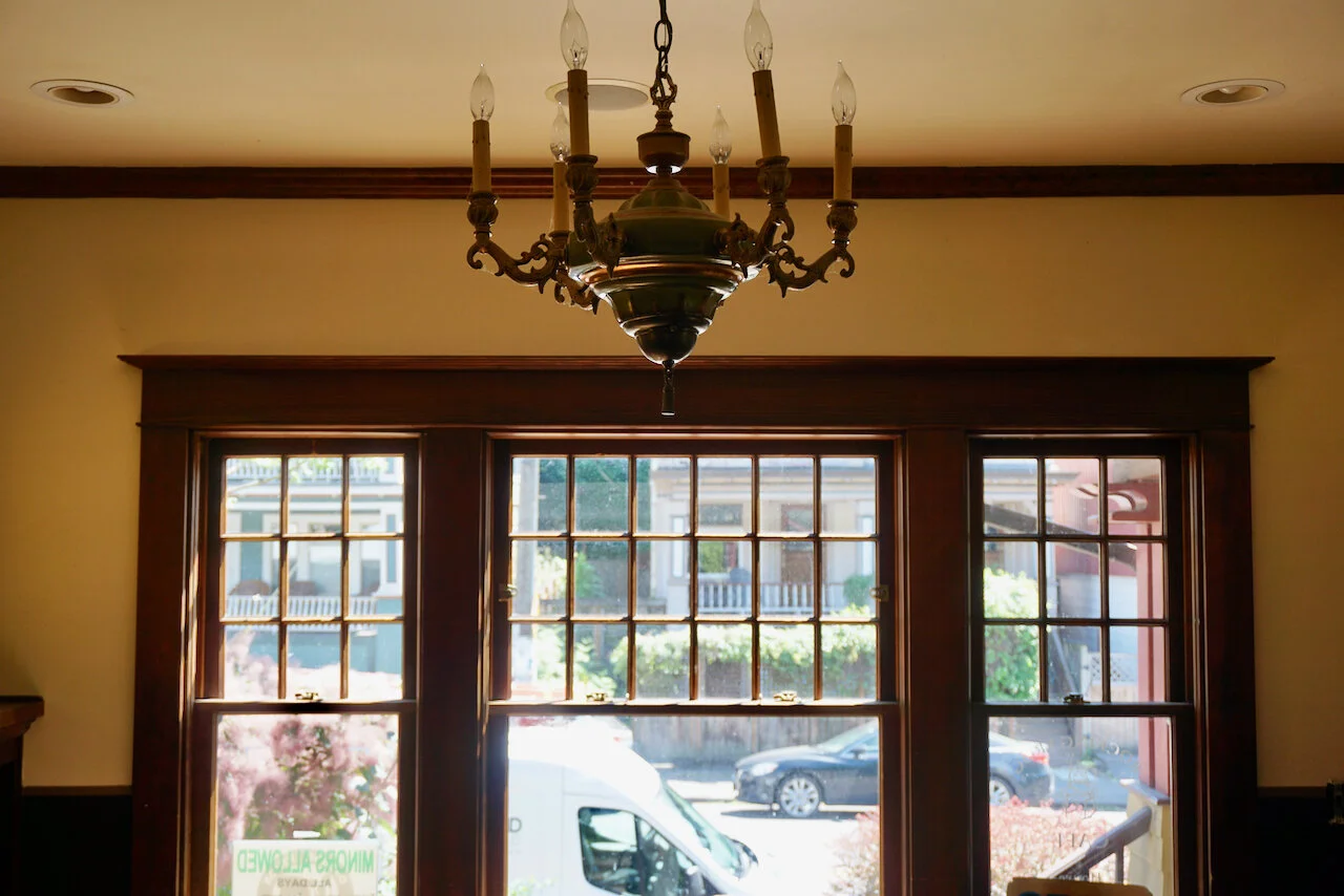 The interior has a warm and cozy feeling like entering a family home, and Burke wants to keep that character intact even through the remodel. Notable features include vintage 70’s chandeliers, acid wash leaning bar tops, stained glass windows, a gas fireplace, and stained fir floor and paneling. The space is small, with a living room, reading room, entryway, and bedroom that will all be turned into intimate seating areas for guests while the attic and basement will be used for storage. A small kitchen will be cordoned off to construct a service bar, and a back door goes out to a relatively secluded patio space that has been taken over by bamboo in the 7+ months that Rocking Frog has been closed.