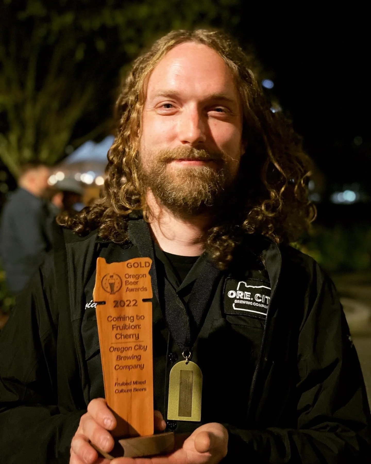 Oregon City Brewing Company’s Brewmaster David Vohden holding his Gold award for Coming to Fruition: Cherry at the 2022 OBAs earlier this year.