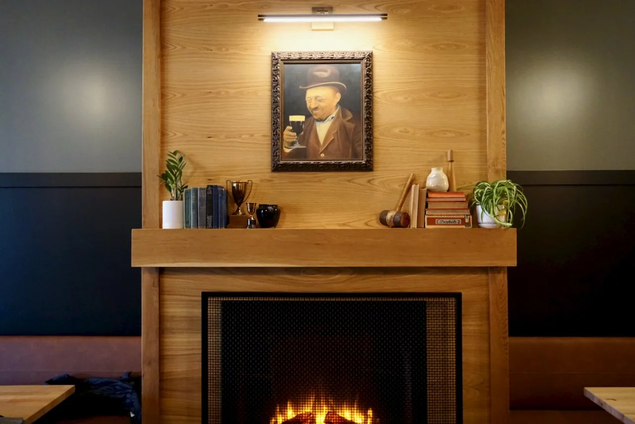 In reconceptualizing Caves, Block 15 Brewing tapped local design agency Shelter NW and Jay B. Construction to make a more clean and polished pub, removing the partial wall between bar area and seating areas and presenting a more open casual warm and inviting space. Little of the before times furnishings are still there except for the bar, some lighting fixtures and tables. Instead they leaned on the help of local tradesmen for more handmade and functional touches to comfortable seating and minimal decor accentuated by plants and the new fireplace, mantle and paintings that align around a cozy den. Kristen Arzner’s original photography from the trip to Belgium that inspired Caves is still hanging along the walls and inspired parts of the remodel like the white brick wall near the back of the room, similar to Les Caves Dupont.
