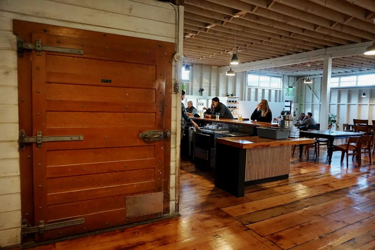 The Obelisk Beer building has the feel of an old beer hall meets industrial production space with a street level entrance that opens into an entryway and loading right into the brewery with a step up to a slightly elevated loft level where the public taproom is. The 3k sq. ft. building has the wide-open quality of an event space with a 7 seat bar part of 49 total seats from scattered tables across a restored old growth doug fir floor. Coyne and Lampson patched up the timber flooring themselves by reclaiming pieces of doug fir from other parts of the building to cut new tongue and groove to repair damaged areas. It was no easy task, as they had to teach themselves to sand through 4 grits, and fill in cracks with rope and 4 coats of marine polyurethane.