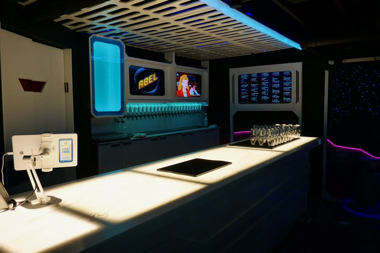 The attention to detail in the taproom is superb, from pulsing pinhole LED lights simulating stars, to a swirling projection of the outer reaches of space inside the bathroom. The bar area has cords hanging down to the glowing table tops, the back bar tap handles are lit like a Tron speeder bike, retro cartoons are the only thing playing on TV, unless you count the small monitor webcam display showing a grainy live feed of how many slices of pizza are left in the hotbox.