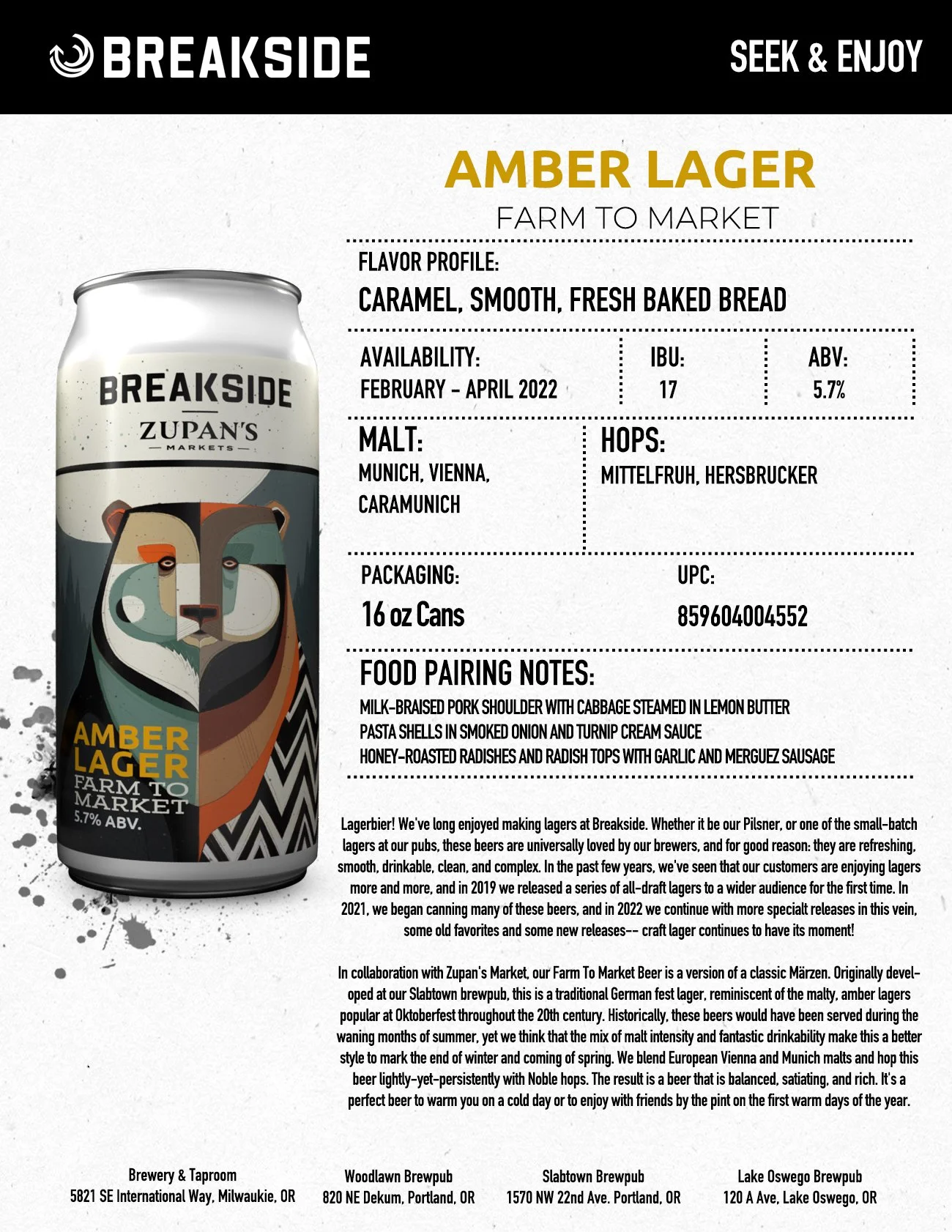 The latest collaboration in Zupan’s Markets ongoing house beer brand Farm-to-Market series is with Breakside Brewery. The beer is an all too rare classic German Märzen lager style, and marks the 18th beer release in the series. In the vein of an Oktoberfest, this malty, amber lager is a perfect beer to warm you up on a chilly day or to enjoy with friends by the pint on the first warm days of the year.