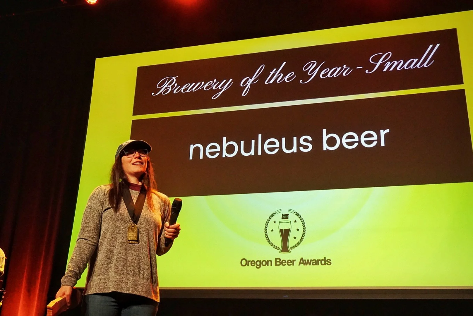 Rachel Olen accepts the small brewery of the year award for nebuleus beer at the Oregon Beer Awards 2022