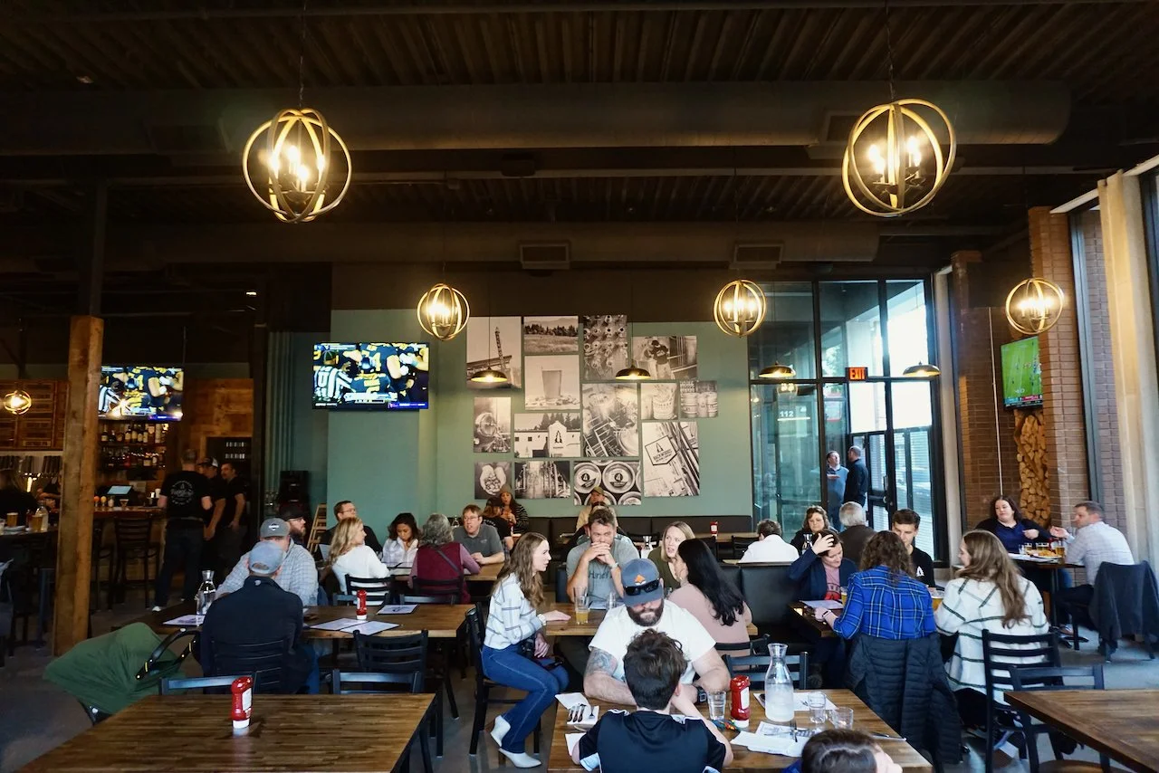 The main Backwoods Hillsboro pub is marked by a wide entrance displayed below their logo that opens into a foyer-style entry with beer to-go and a check-in host stand with string lighted canoes hanging overhead. While the building is more functional concrete metal in design, Backwoods has done a lot in warming the space up to give it their signature brand of woody atmosphere.