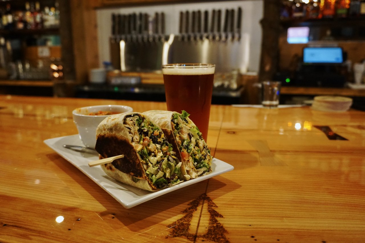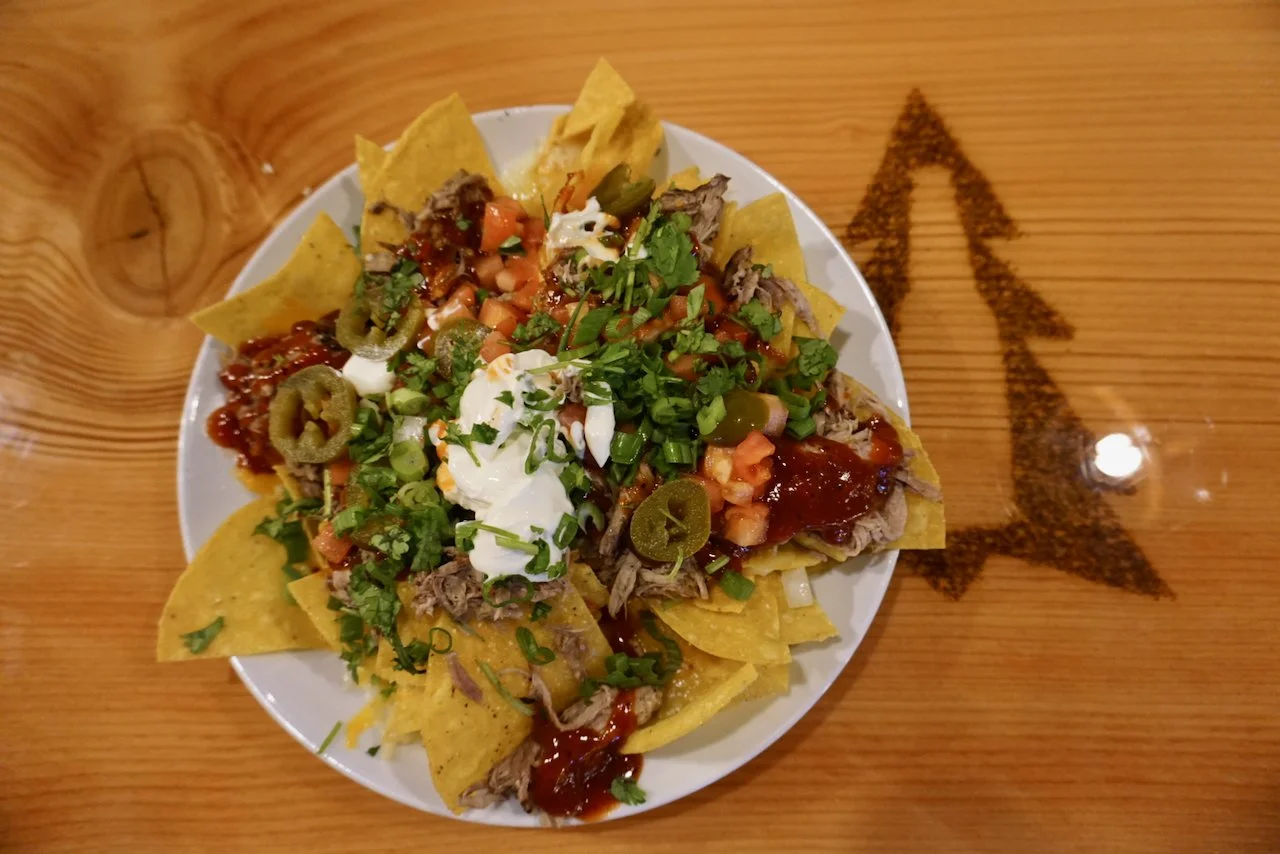 We started out the meal with a shareable size portion of the ‘Fried Pickles' ($10.75), these are spear sized pickles in a buttery crust that were really excellent with ranch and served in a larger basket than we anticipated. For the main meal we went with the ‘Fiesta Chicken Wrap’ ($15.50) Fajita chicken with spring mix, pico, black bean salsa, mix cheese, tortilla strips and avocado with our jalapeño ranch dressing, with a cup of a ‘Chicken Tortilla Soup’ on the side. This was a mammoth wrap, extremely well constructed and easy to eat with just the right amount of sauce so as not to get too drippy, the soup was solid but safe on the spicing. And we couldn’t help but try the ‘Pulled Pork Nachos’ ($16) because the photo used online looked so good and I cant resist a good nachos. I found out they are available with chips or as tots instead, but for me the tot option can just be too over the top so I went with the chips. The entree sized plate is topped with pulled pork and Backwoods own Copperline Amber barbecue sauce, with house made tortilla chips, shredded nacho cheese, diced tomatoes, onions, cilantro, jalapeños and sour cream.