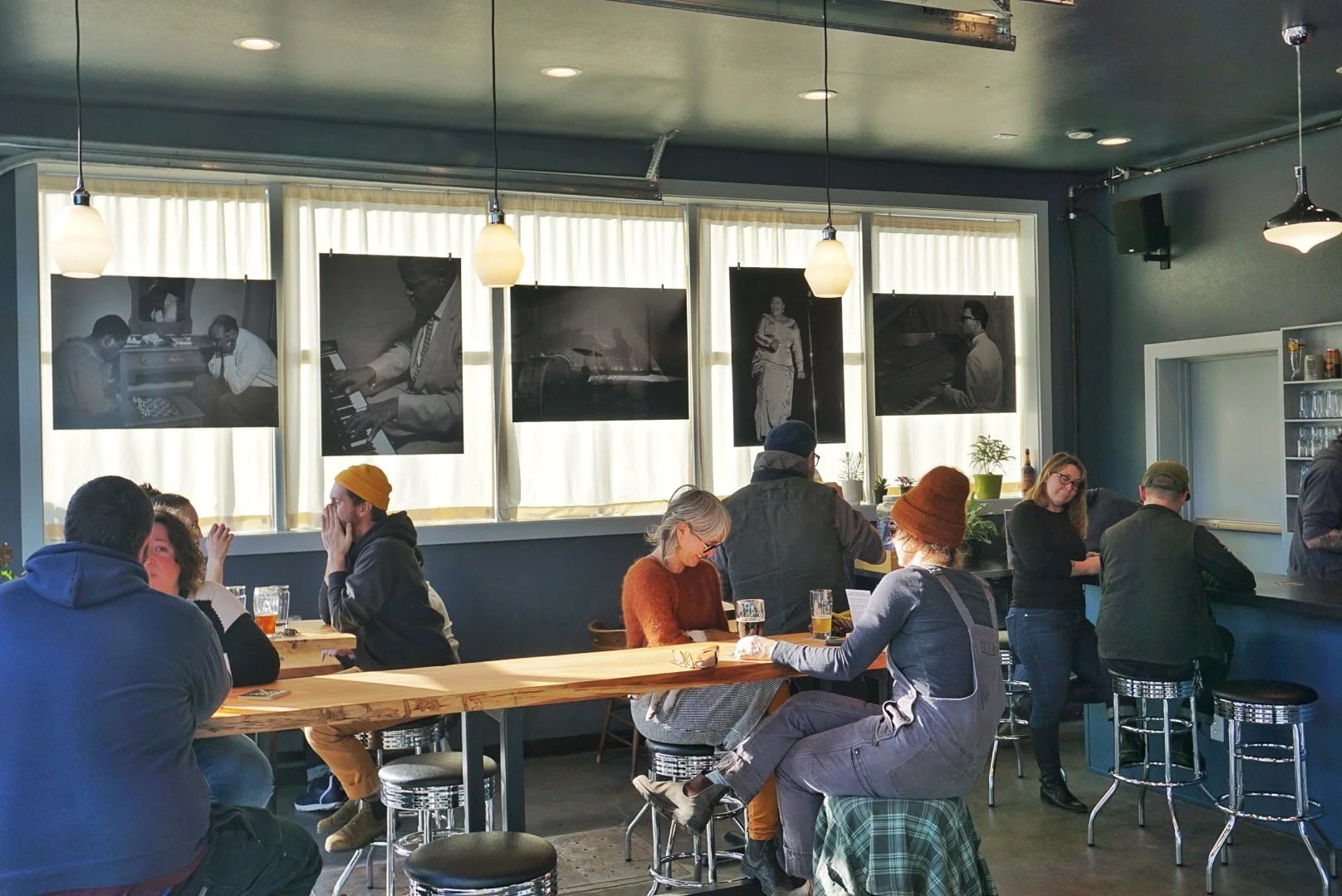 Long, tall, standing height beer hall-style tables fill the center of the room and a few more intimate low 2-4 top tables are against the west wall against curtain draped windows and five different elegant prints of famous jazz musicians.