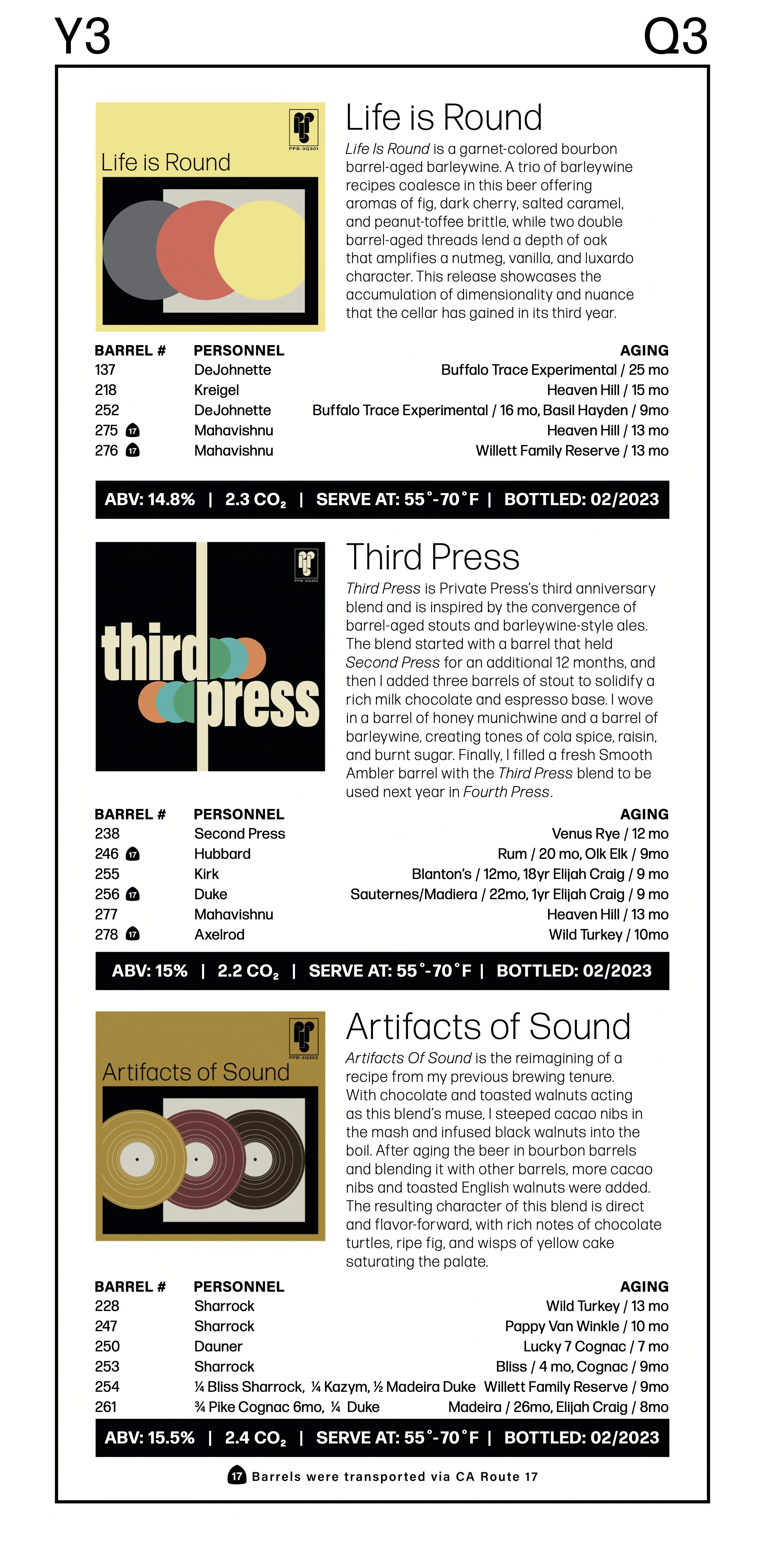 Brad Clark: I remember having 10, the first of the Anniversary Ales, in 2008. The idea of blending styles, barrels, and letting winemakers drive the blending process just blew me away. It was the first beer that I had encountered that was a component-driven blend and the first example of conceptual brewing/construction I had experienced as well. I soon created a series at Jackie O’s called “Cellar Cuvee.” The first 2 Cellar Cuvee releases were different beers blended and aged in 1 barrel. As the series progressed, I started blending multiple barrels. Now at Private Press, every single release is a component driven blend that is deeply rooted in the moment I drank 10.