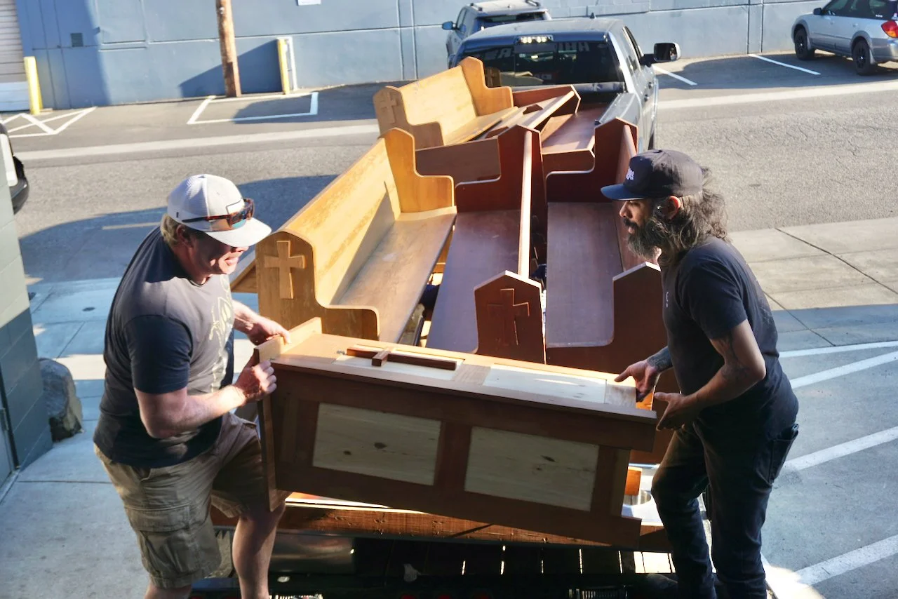 Moving their new church pews and pulpit into the new Brujos Brewing location