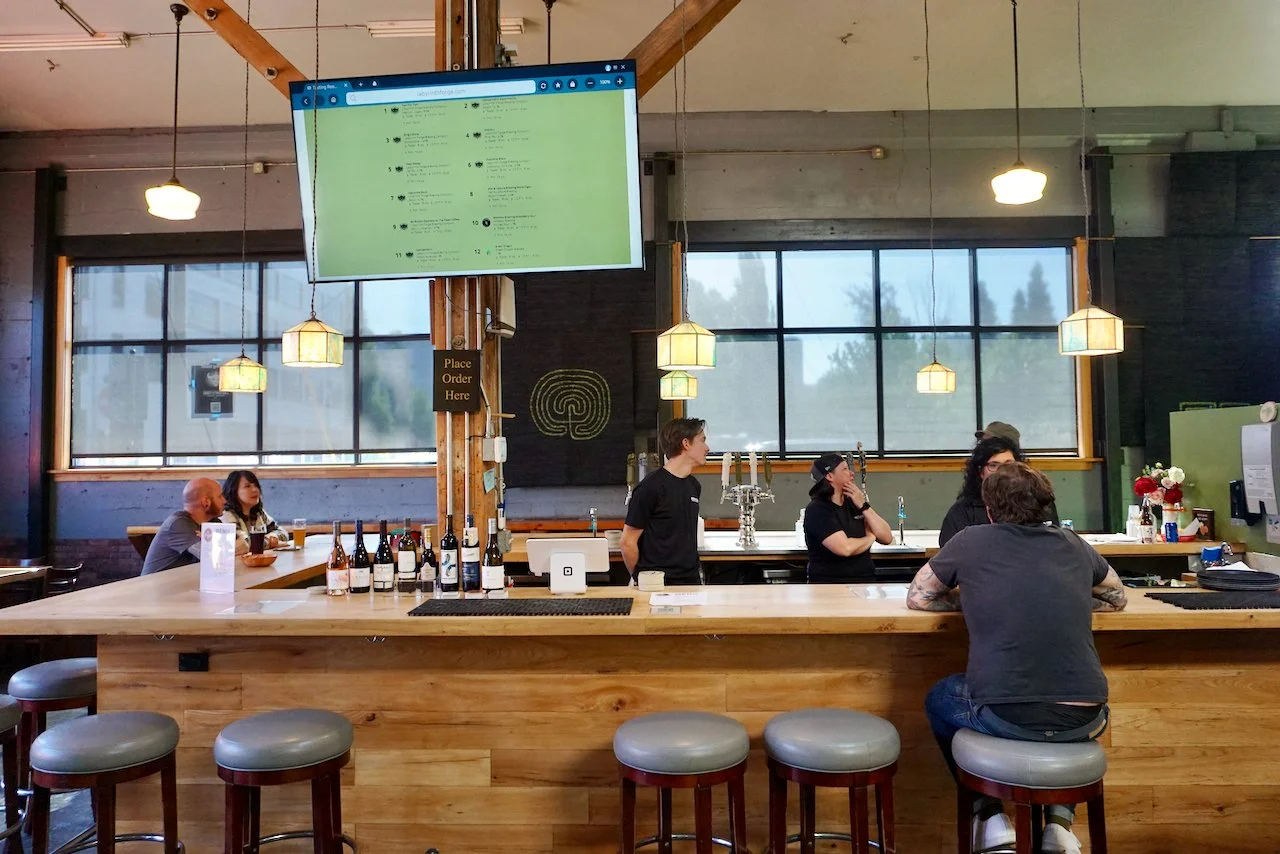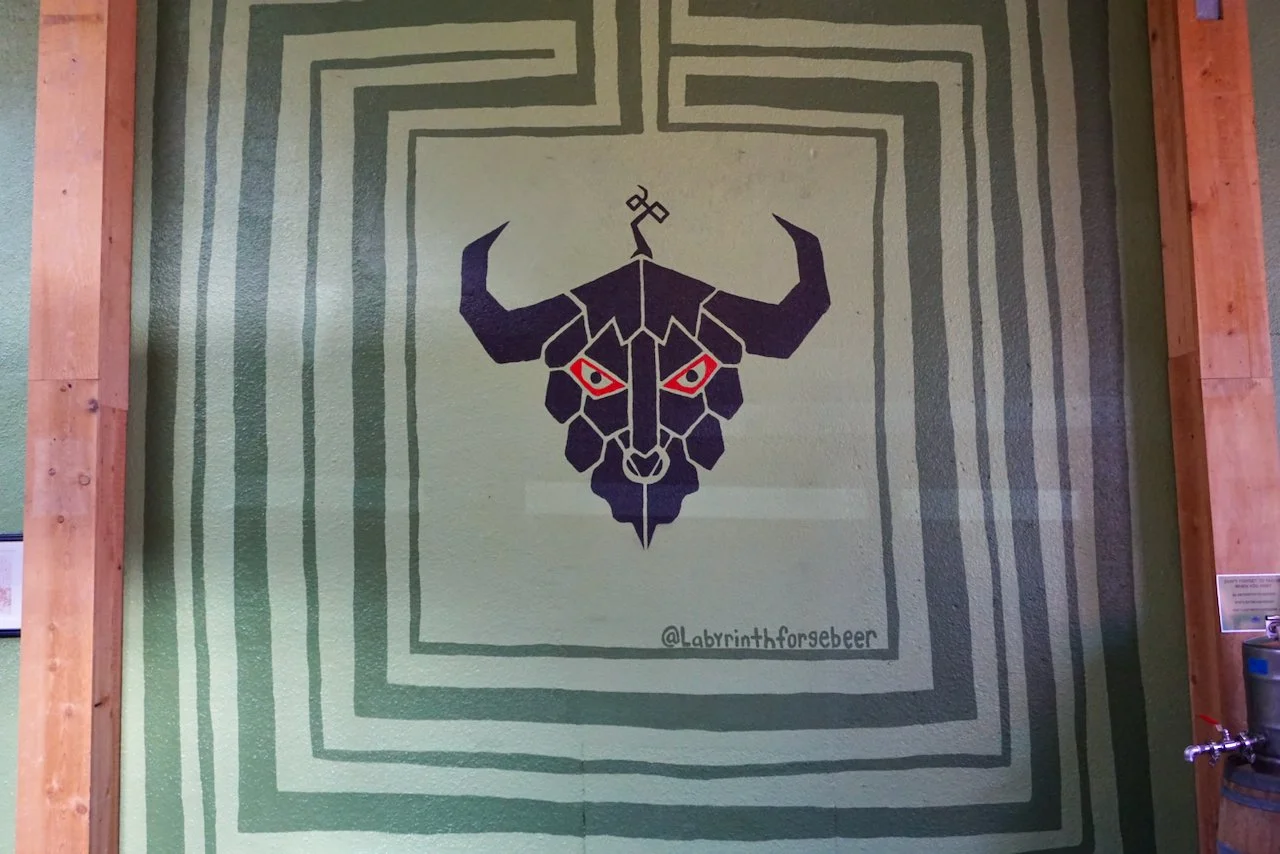 The new Labyrinth Forge taproom still has the recognizable structure and the oak slab bar that was so familiar at Hair of the Dog. But Labyrinth Forge is slowly making the space their own with their signature gray and pale green and black color scheme, with the slightly askew labyrinth around the head of their minotaur logo on the east wall and Cretan labyrinth tapestry mats hanging from the west wall. Roll-up doors open to outside street seating on Yamhill, and the wrap around bar is still the central feature for conversations and tastings with the crew.