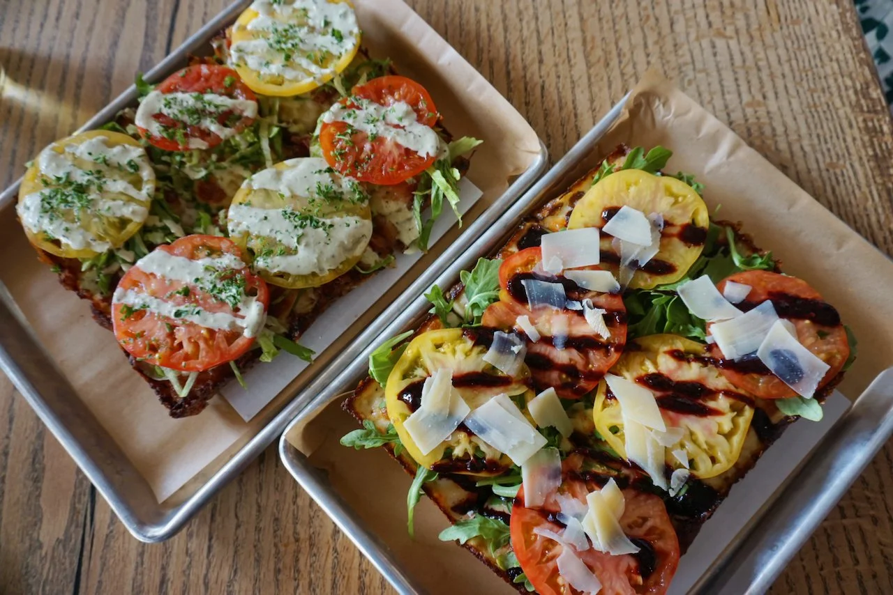 Ruse co-founder Devin Benware was already a big fan of heirloom tomatoes, he grows them at home and calls them his favorite fruit. So when prompted to do a special, they jumped on the idea quickly and proposed it to their sous chef Oscar Suarez. Together, they dreampt up “Shapes of Nature,” an extra colorful popping arugula topped Detroit-style with fresh oregano, shaved parmesan and a house-made blackberry-balsamic dressing sweeted with maple sugar. The next day Oscar showed up to trial it and also found the ingredients to do the BLT inspired “The Spurley,” with bacon lardons melted into a thick skin of brick cheddar, topped with shaved ice berg lettuce, whole slabs of heirloom tomato coins, and topped with a spicy-creamy house-made jalapeno ranch and finely chopped parsley.