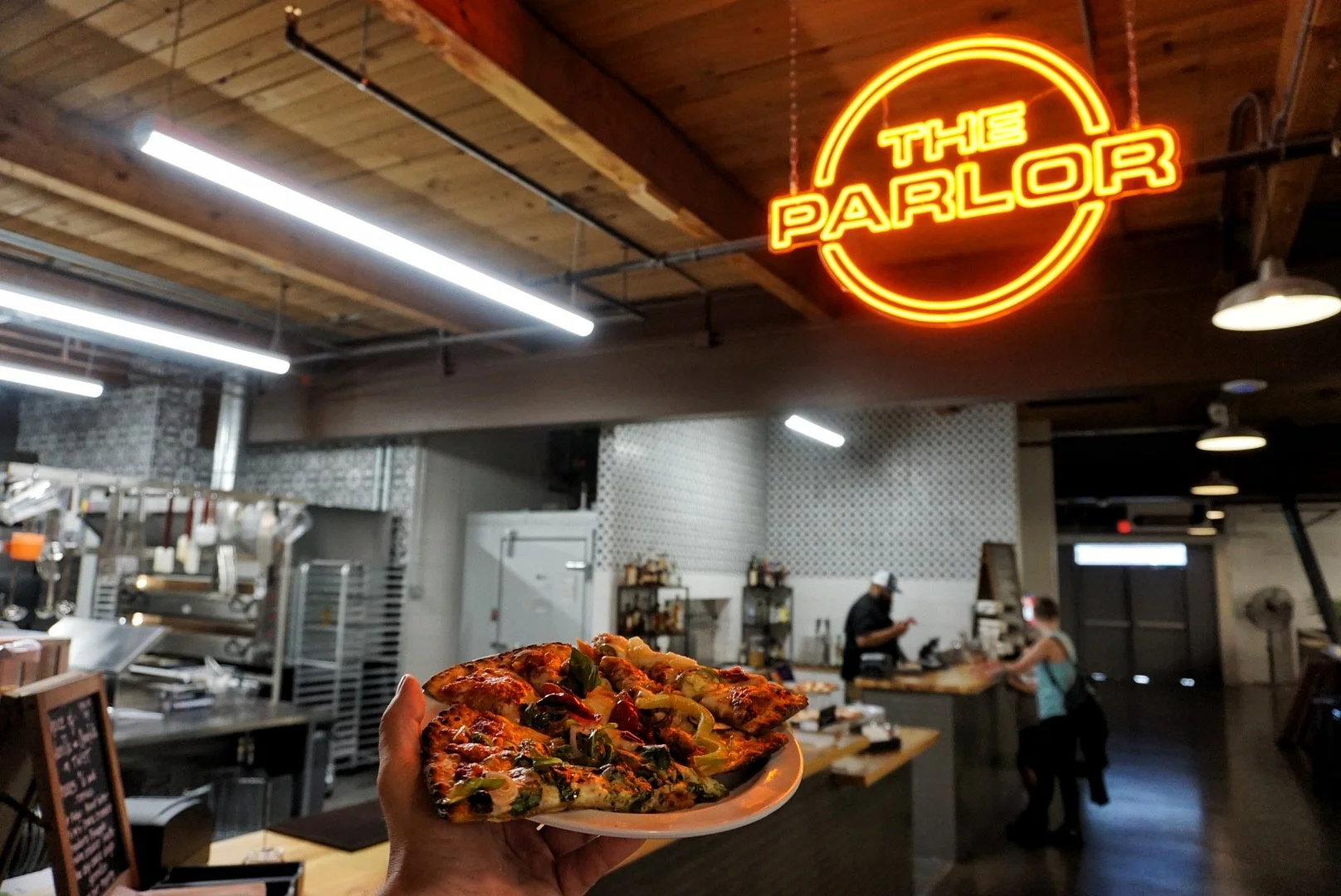 ‘The Parlor’ serves parlor-style pizza created by Brian Spangler of Apizza Scholls, as well as soft serve ice cream. The beverage menu throughout the venue features local beer, wine, craft cocktails and mocktails, and Deadstock Coffee.