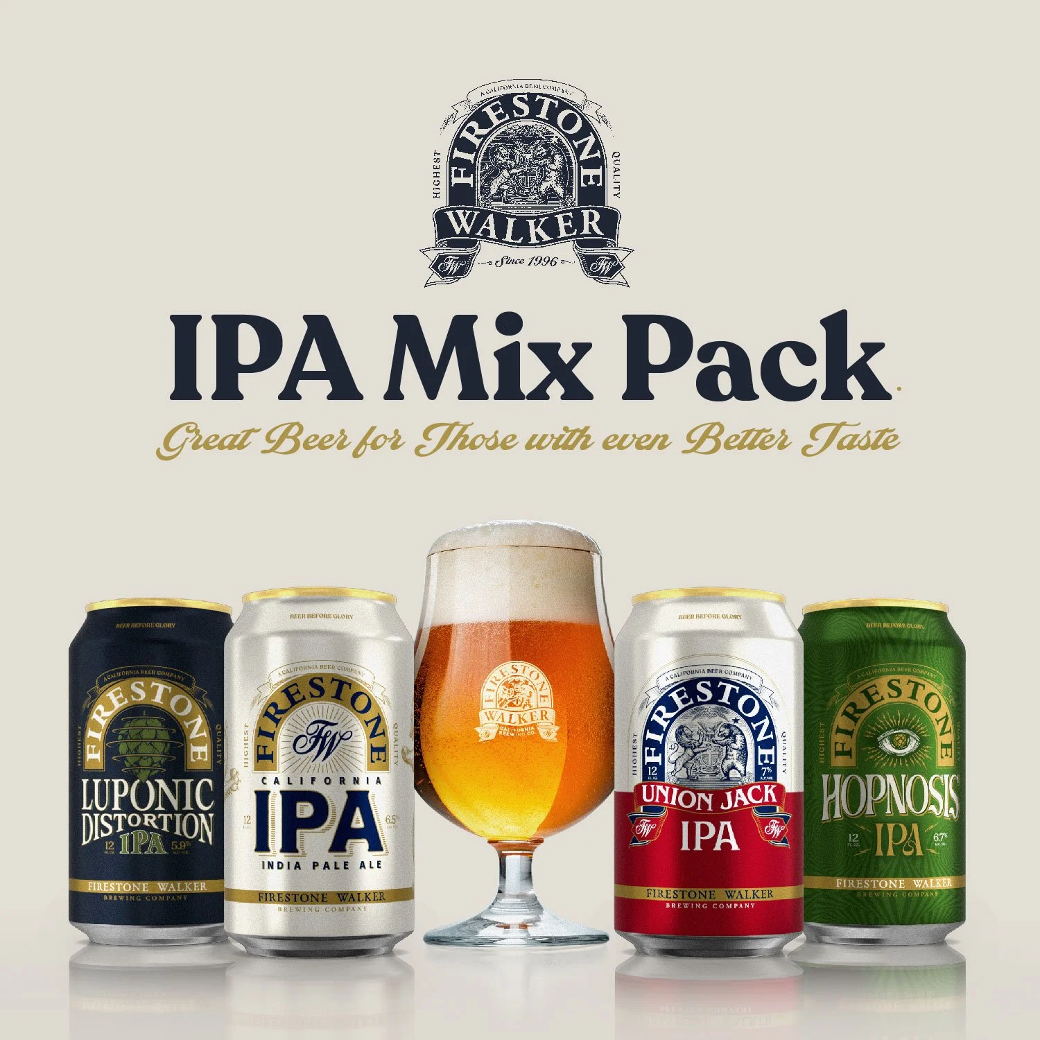 Firestone Walker was founded by brothers-in-law Adam Firestone and David Walker in 1996. Within 10 years, the craft beer revolution was well underway, sparked largely by the surging popularity West Coast IPAs, including Firestone Walker’s Union Jack. Ever since, the West Coast IPA style has been marked by continual innovation and evolution—a phenomenon reflected in the four beers featured in the Beer Before Glory IPA Mixed Pack.