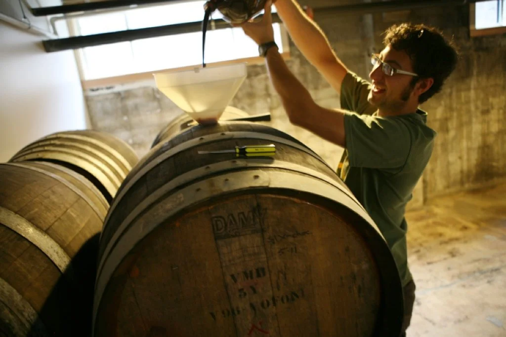 Space was limited and Johnson-Greenough remembers the occasional spillover from the brewing operation into the taproom area. “Every once in a while I would come in to open the taproom on a weekend and there would be an entire river of fruit sludge that had bursted through a bung hole on a barrel and was refermenting all over the floor. I remember at least once when a bung shot off of a barrel and hit the ceiling while people were hanging out drinking, people were ducking for cover.”