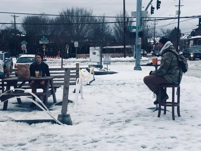 Beermongers devotees enjoying distanced beers in a snow covered parking lot during the pandemic in October 2021. Photo courtesy of John Foyston.