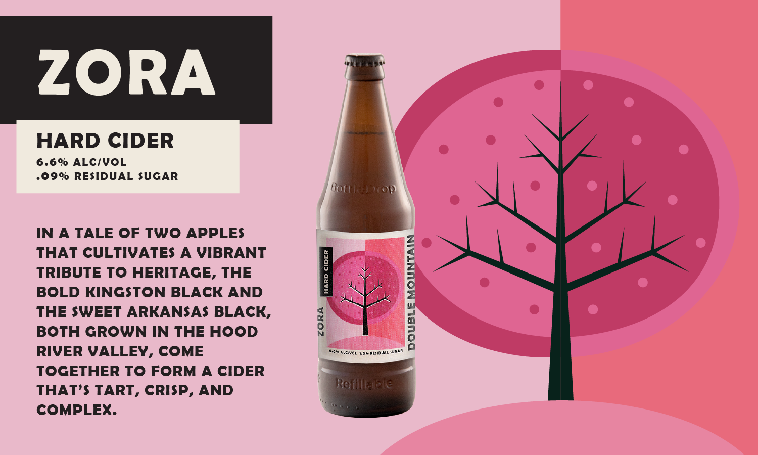 Zora Hard Cider brings together two iconic apple varieties with rich histories. The bittersharp Kingston Black, originating from Somerset, UK, is known for its tannic complexity and bold cider-making qualities. The sharp Arkansas Black, first cultivated in the Ozarks, contributes smoothness and depth to the blend. Though these apples hail from different continents, both varieties thrive in the Hood River Valley, where they are carefully cultivated at Lorrie’s Grove Orchard, Riparian Orchards, and Double Mountain’s own Swihart Orchards; located in Dukes Valley.