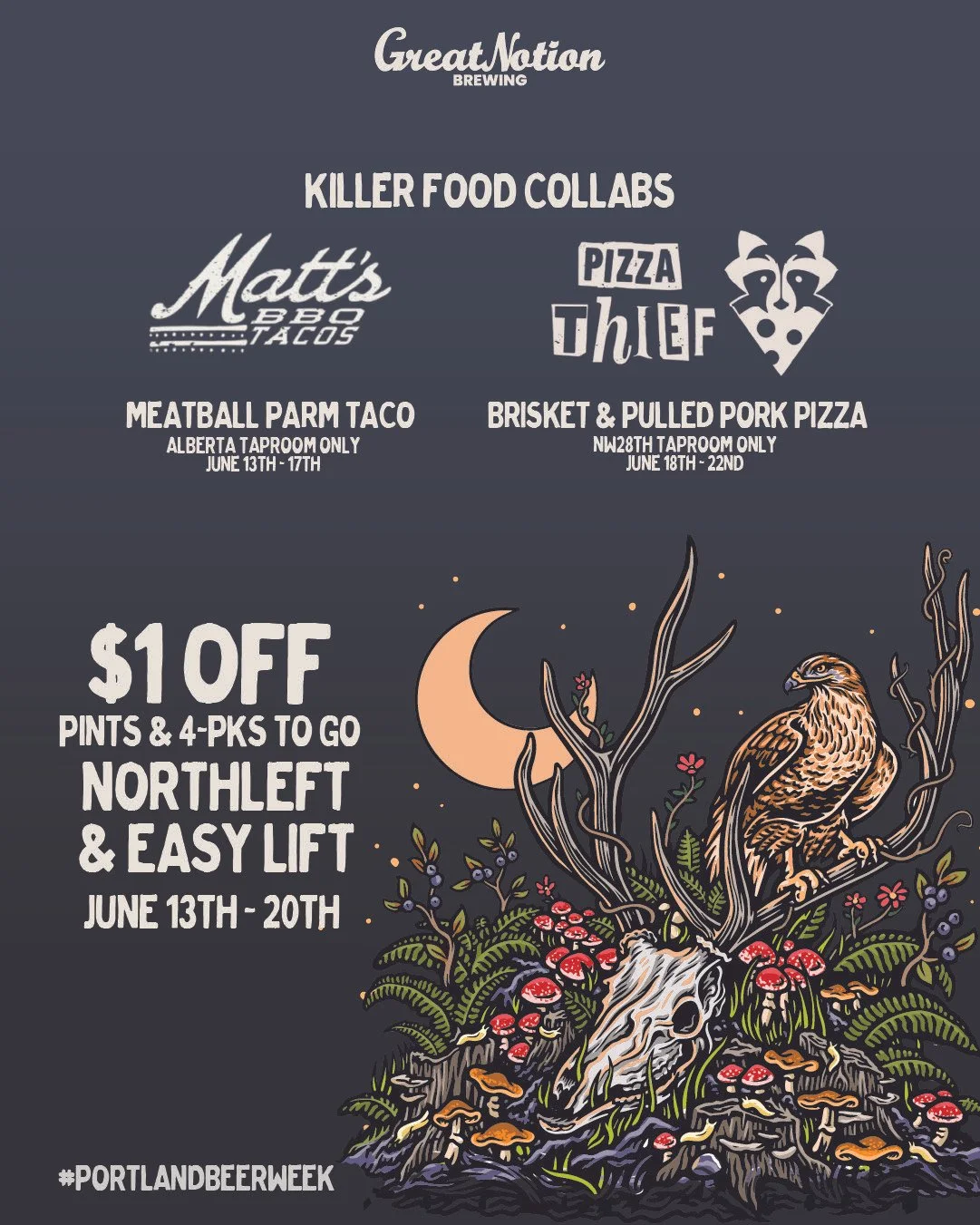 Fri 6/13 - Tues. 6/17 - MATT’S BBQ TACOS + PIZZA THIEF + GREAT NOTION BREWING