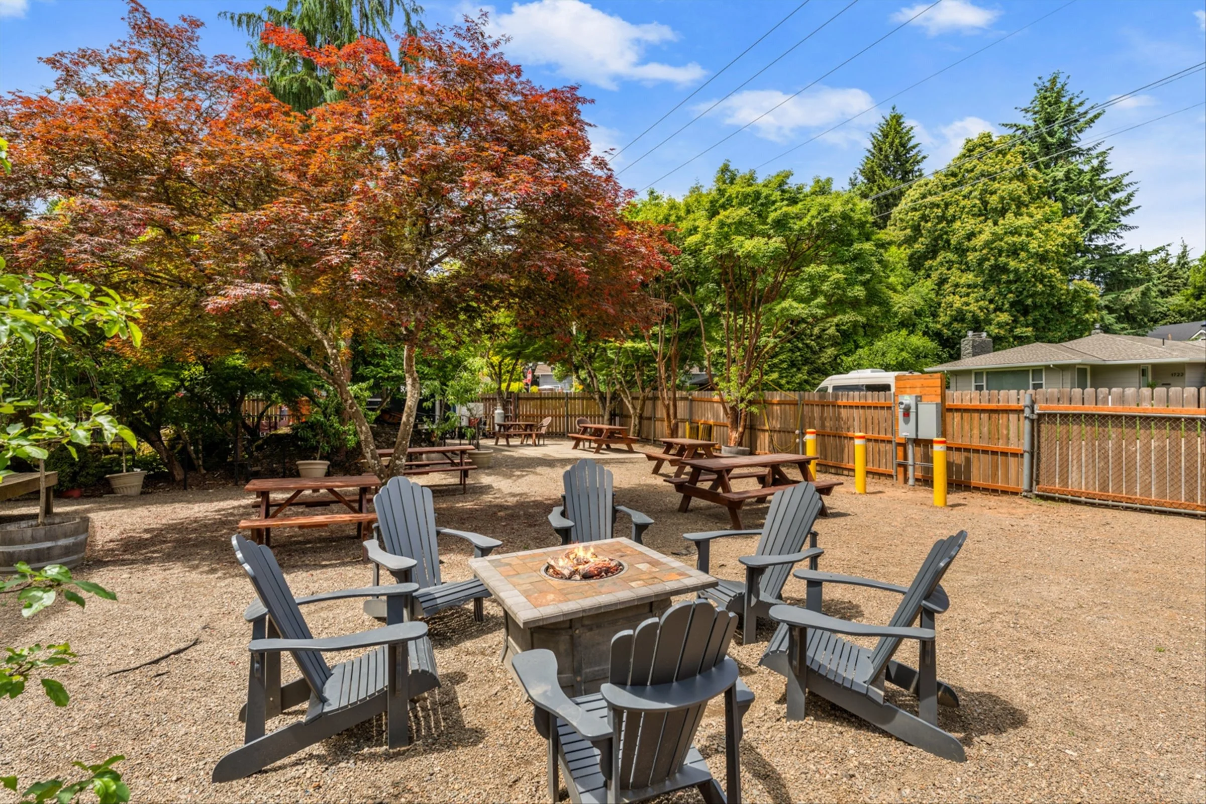 The ‘Cider Hall’ directly behind the indoor pub is an insulated, glassy and natural light filled garden room with a stage for live music and a bar with 12 draft lines and packaged product. To the north of the hall is the ‘Beer Garden’ a semi-permanent tent enclosure with side walls that open or close and a clear ceiling to let the light in. Behind the enclosed areas is the outdoor garden, a fenced in spacious patio lined with greenery and trees, well spaced picnic tables, a gas fire pit, and 6 different food trucks.