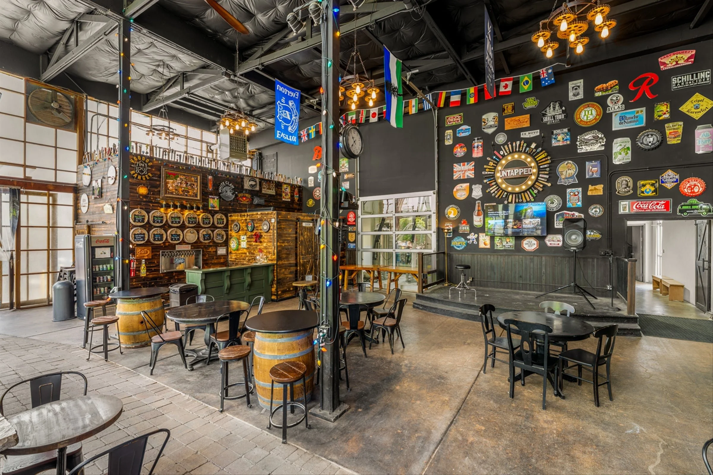 The front lounge is a quaint dining and sipping area with warm natural light from windows facing downtown West Linn. It’s a great area to enjoy a drink from one of two bars inside and bites from up to 6 food trucks outside.