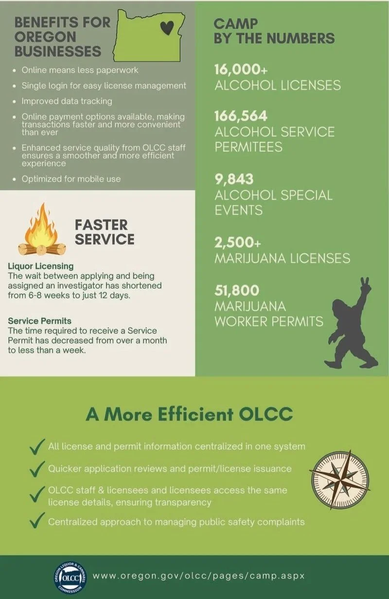 The Oregon Liquor and Cannabis Commission (OLCC) is celebrating the implementation of a modernized, all-digital licensing platform. The Cannabis Alcohol Management Program (CAMP) provides the 230,000+ Oregonians who work in the alcohol and cannabis industries with a one-stop shop for all their licensing and permitting needs.