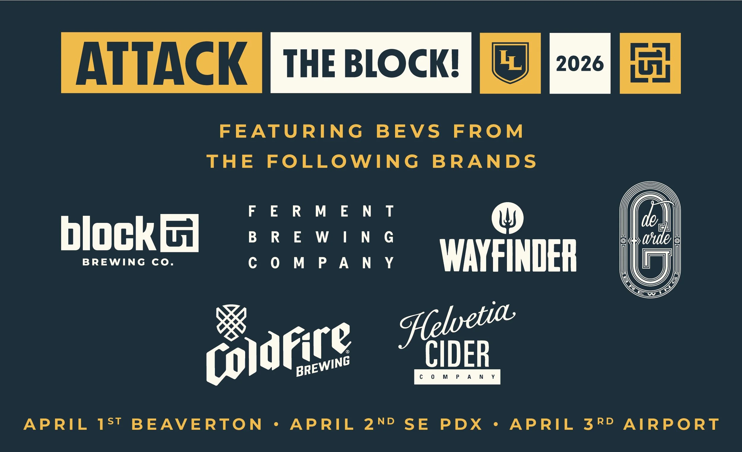 This year’s Attack The Block is a full tap takeover at all three Loyal Legion Oregon locations over three days April 1-3rd. The event features 5 breweries and 1 cidery from Block 15 Distro’s craft producers and timed to coincide with the 2026 Oregon Beer Awards, one of the industry's most significant weeks of the year.