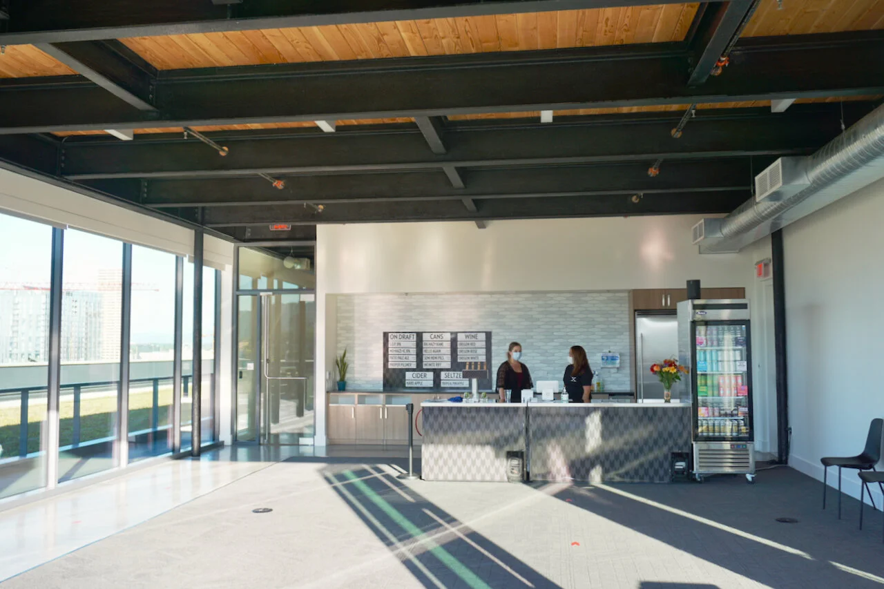Originally envisioned as an office community area for social events, work breaks and office events, the 9th floor rooftop was not intended to be a commercial space. With the ongoing effects of COVID-19 discouraging live sporting events and on-site office visits, the developers knew filling the Canvas building with tenants would take some time. Migration Brewing makes for a sustainable pivot that will draw people to the area and in time could become a hotspot for happy hours and late night drinks before and after sporting events across the street.